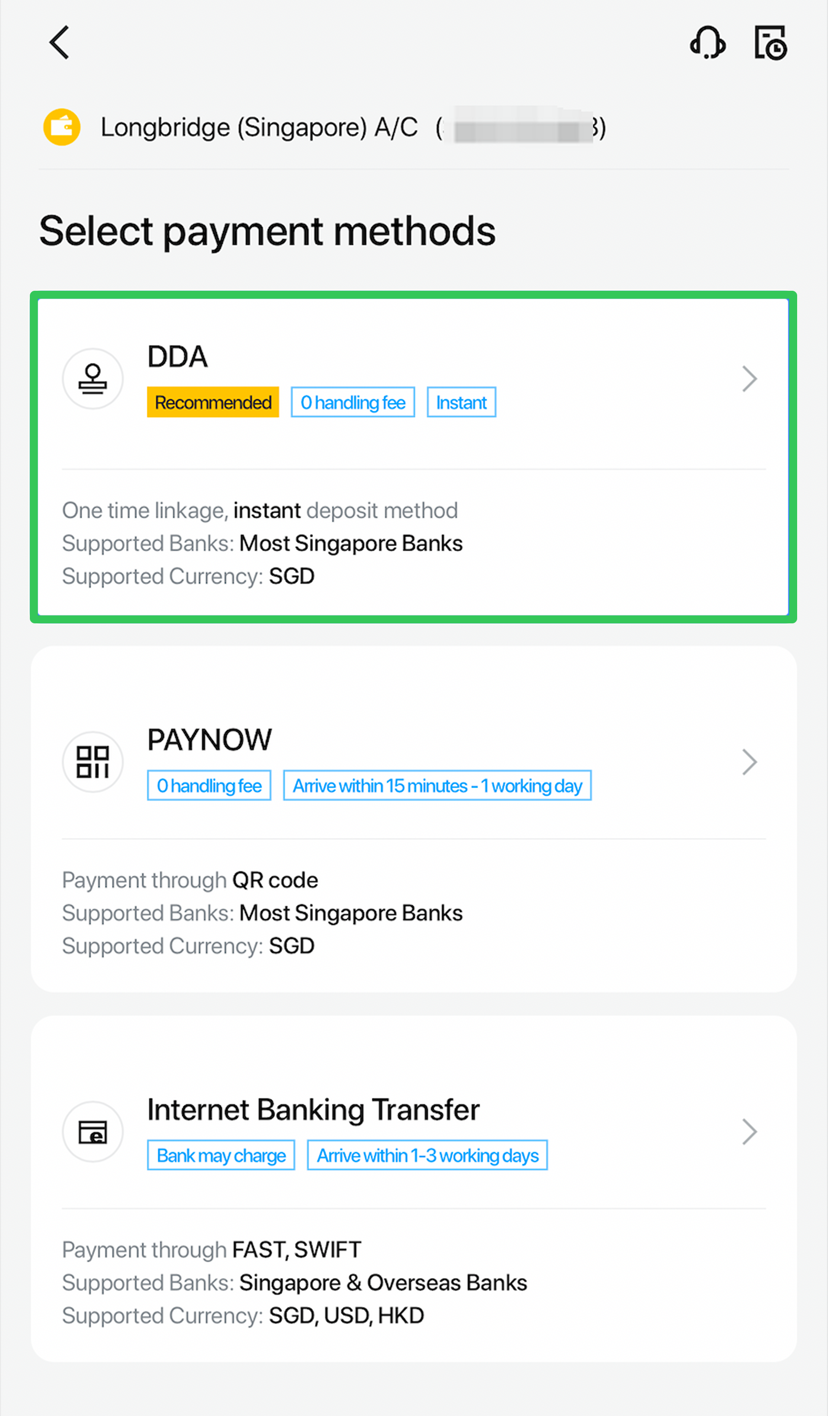 DDA (Direct Debit Authorization) is an authorized transfer service provided by banks in collaboration with Long Bridge Securities Pte. Ltd.