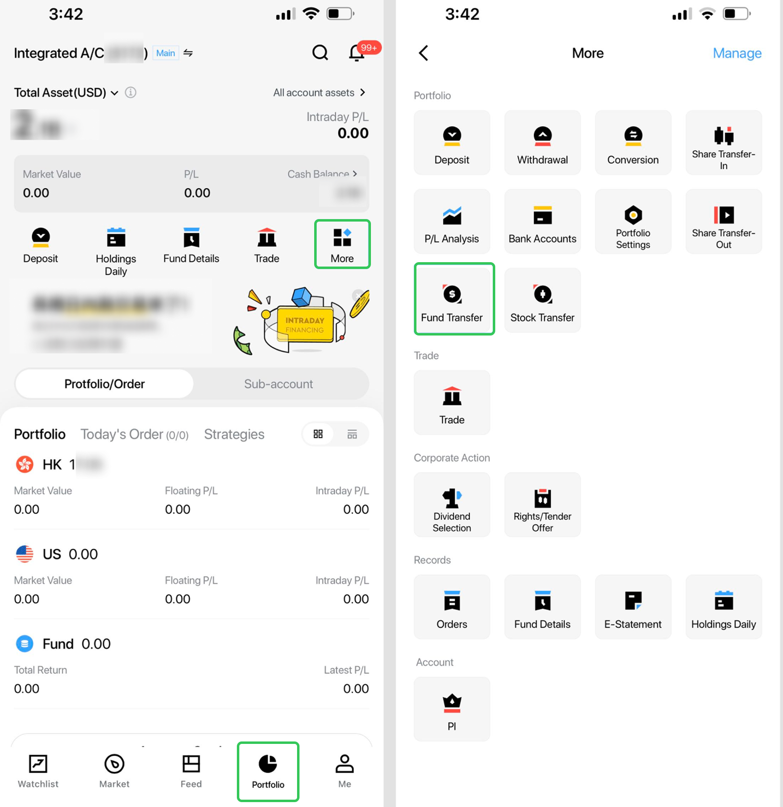 Step1. Locate the fund transfer feature on your Longbridge App.Go to Portfolio > More > Fund Transfer.