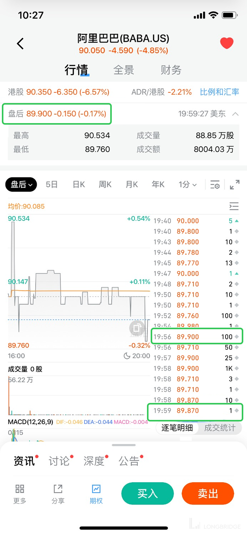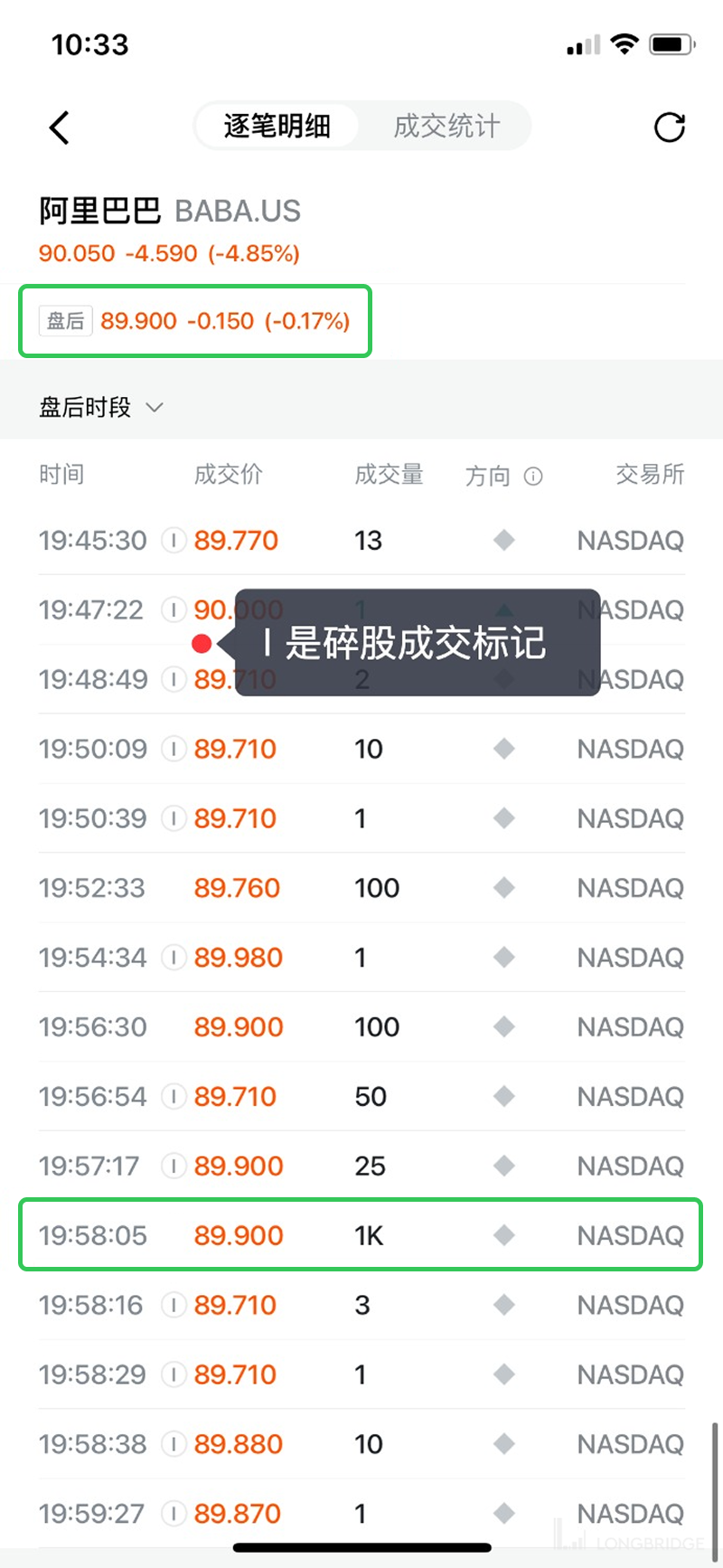 此外,不同的券商可能对这个规则应用方式不一致,导致不同平台看到的最新盘前盘后成交价不一样。我们可以查看具体的成交明细详情页,以确定最后一笔非碎股成交的价格是多少。