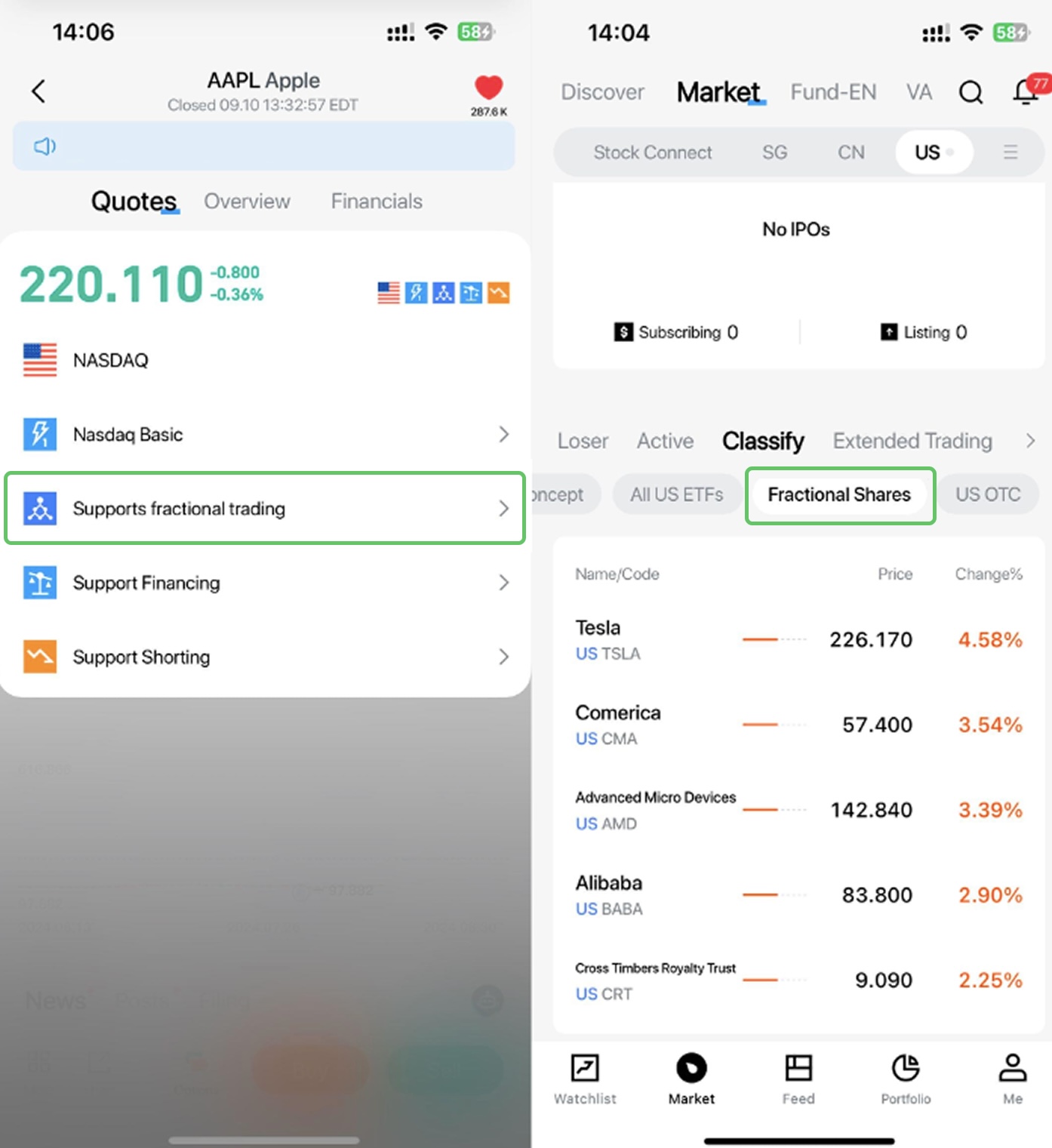You can find the stocks that support fractional shares trading under Market > Classify > Fractional Shares. Additionally, the details page for individual stocks supporting fractional shares trading will display a fractional share icon.
