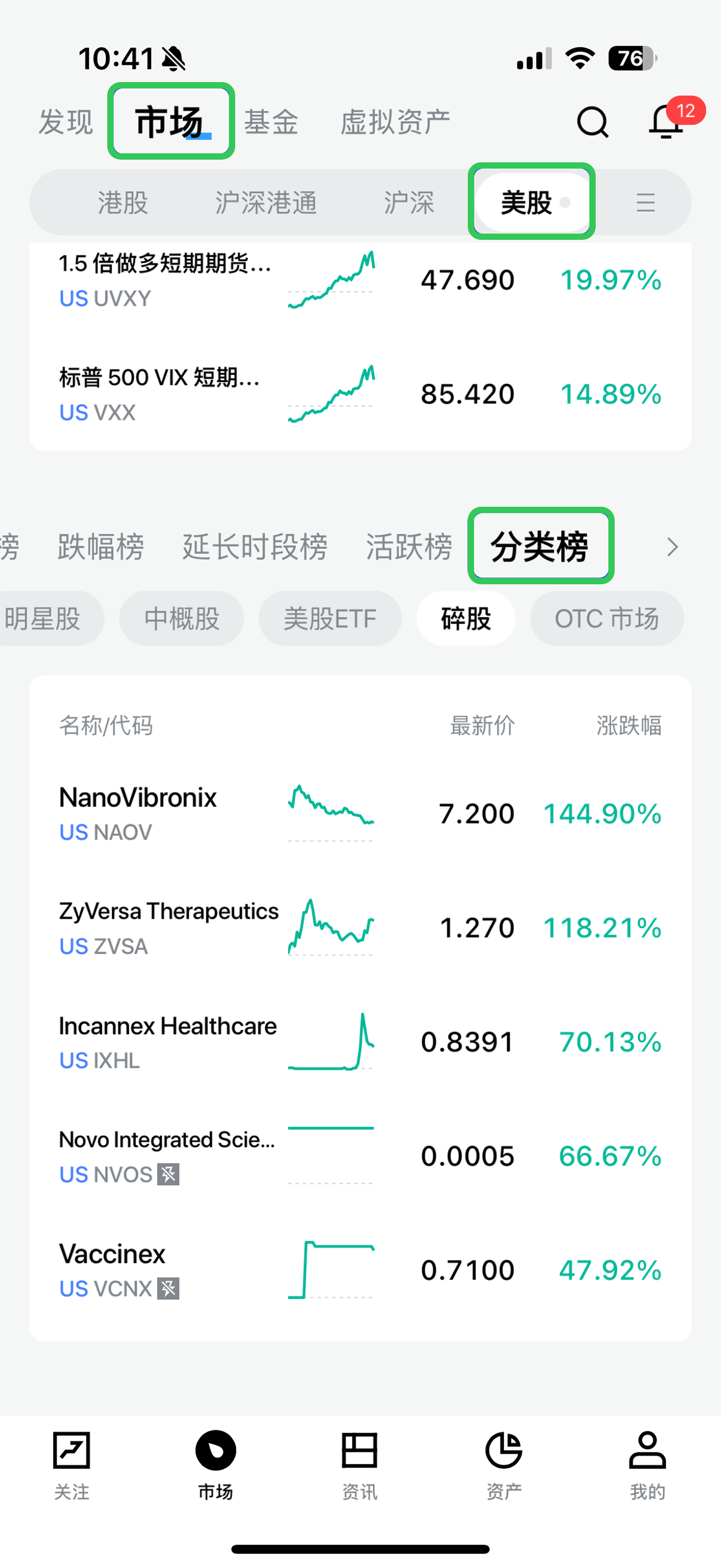 您可以通过市场 > 分类榜来查找支持碎股交易的标的,同时,相关个股的详情页面也会展示碎股图标。